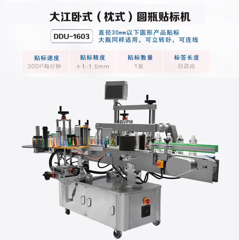 DDU-1604立式圓瓶貼標(biāo)機(jī) 適用范圍:用途廣泛!主要適用于醫(yī)藥、日化、食品等行業(yè)的圓柱形包裝容器的自動(dòng)貼標(biāo).該機(jī)拓展性強(qiáng)!可選配各類(lèi)打印機(jī)完成在線實(shí)時(shí)打印,可單機(jī)使用,亦能連接生產(chǎn)線使用主要性能結(jié)構(gòu)特點(diǎn):1、中英文觸控屏操作系統(tǒng),真正實(shí)現(xiàn)人機(jī)對(duì)話,操作簡(jiǎn)單易學(xué)…